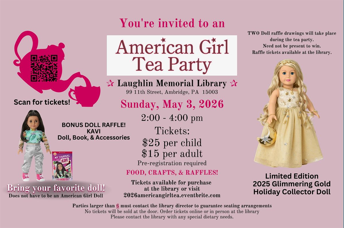 Food, crafts, and raffles! Bring your favorite doll! (It doesn't have to be an American Girl doll.)