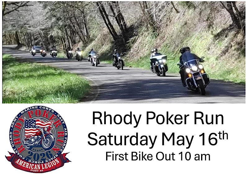 $1000 HIGH HAND-$500 LOW HANDA merican Legion Post 83 Riders poker run to raise awareness and funds for veterans and our community.