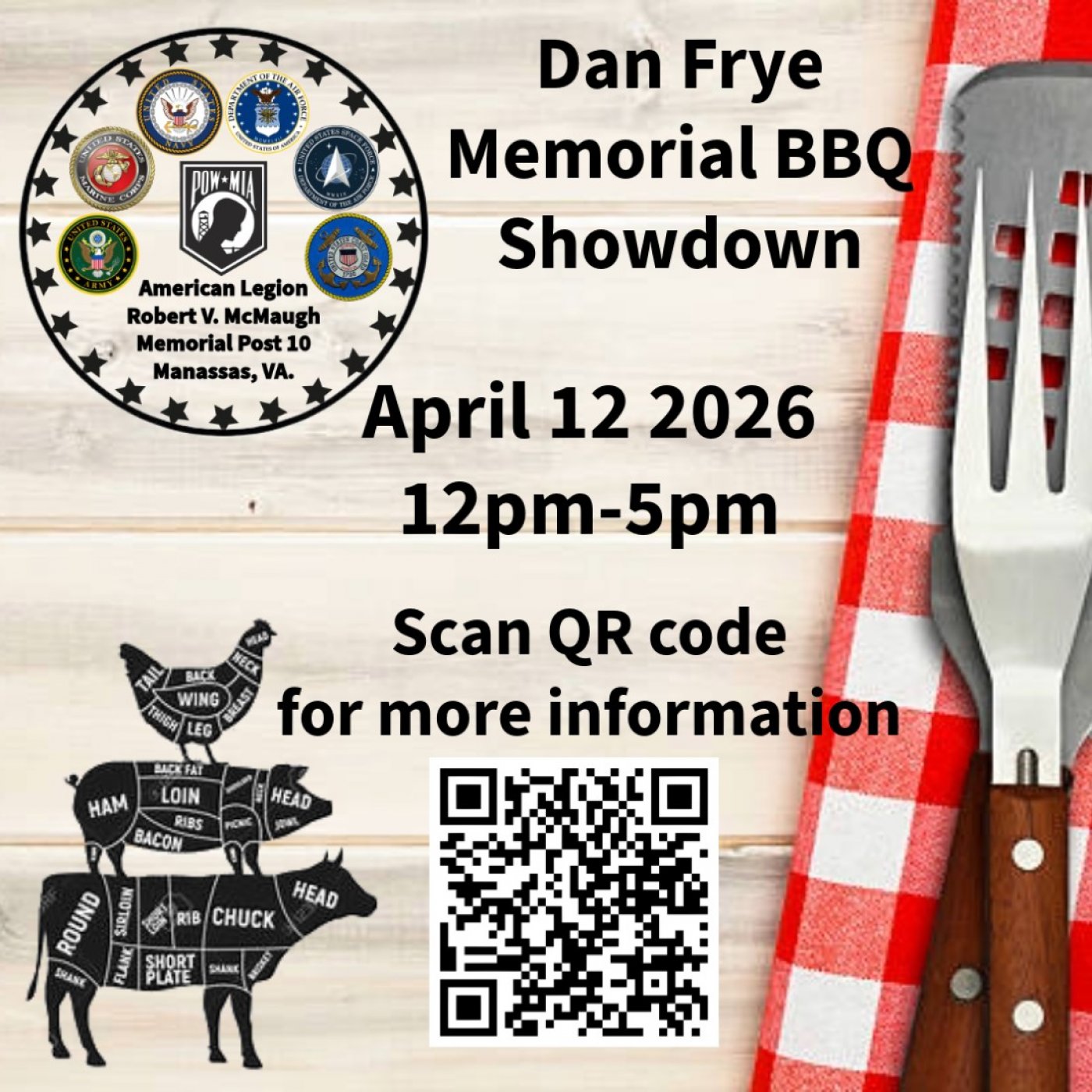 If you'd like to compete in the event you may pay here and fill out the application form on our website and return it to BBQ Competition C/O Post Commander 9950 Cockrell Rd. Manassas Va. 20110. Open to the public on April 12th at noon. Cooks begin cooking on April 11th with judging on April 12th.
