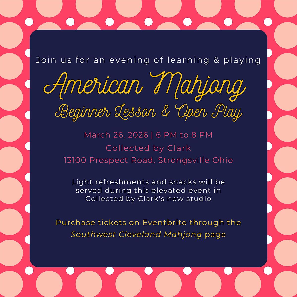 Gather with us at Collected by Clark in Strongsville on March 26, 2026 from 6:00–8:00 PM for a welcoming and elevated night of tiles and community.