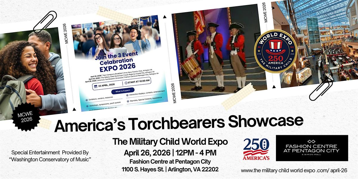 Welcome to the America's Torchbearers Showcase - Celebrating America's 250th Anniversary! Join us at the Fashion Centre at Pentagon City on April 26, 2026 at 12:00 PM (Eastern Time) for an afternoon filled with patriotism and pride. This event will showcase the talents and achievements of individuals who embody the spirit of America. Don't miss this opportunity to honor our nation's legacy and be inspired by our torchbearers. See you there!