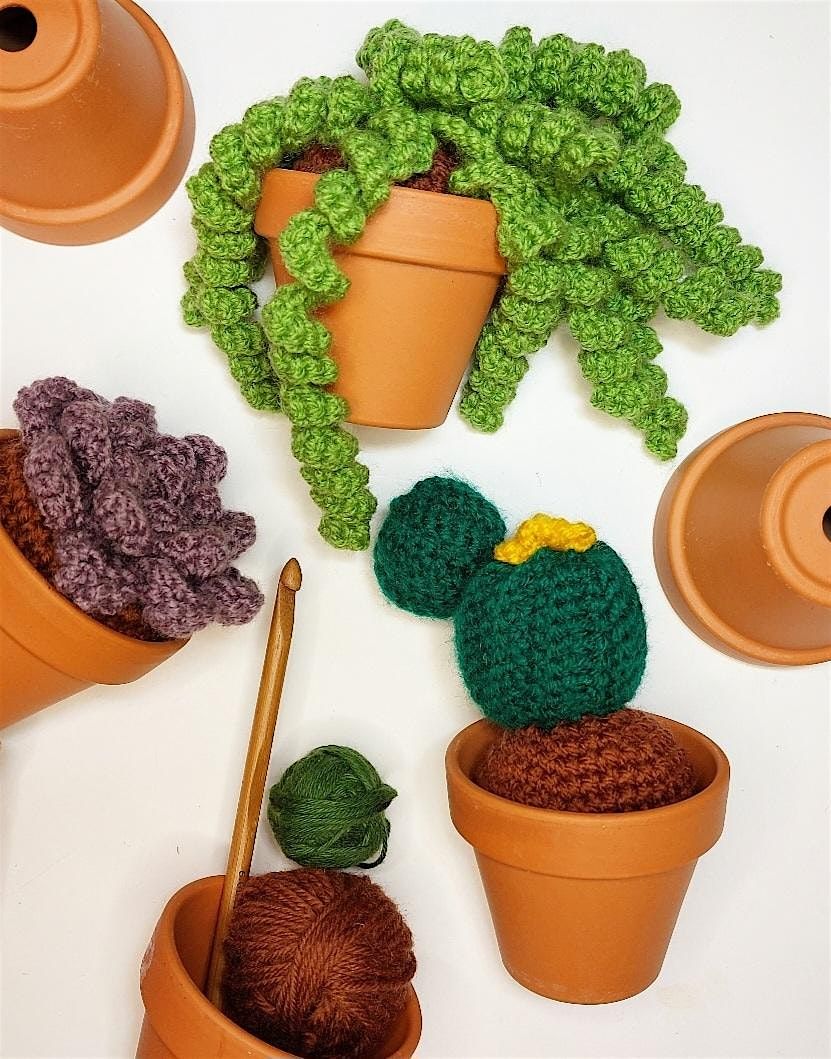 Throughout this full day course you will learn several crochet skills and then put them into practice by making some beautiful mini succulent plants: Crassula, Ball Cactus and Purple Echeveria!