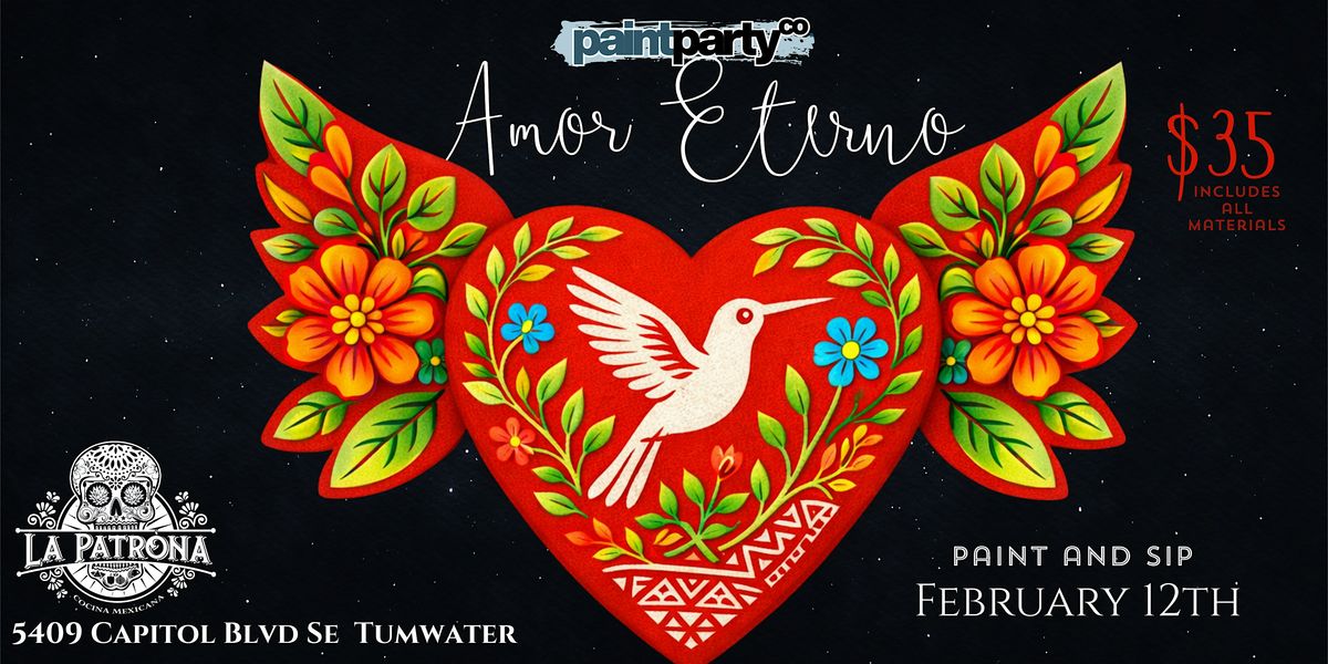 Celebrate love, art, and connection at Amor Eterno, a guided Paint & Sip experience hosted at La Patrona Cocina Mexicana in Tumwater. Inspired by Mexican folk art and timeless romance, this evening invites you to unwind, sip, and create a beautiful heart-and-hummingbirds painting—no experience required.