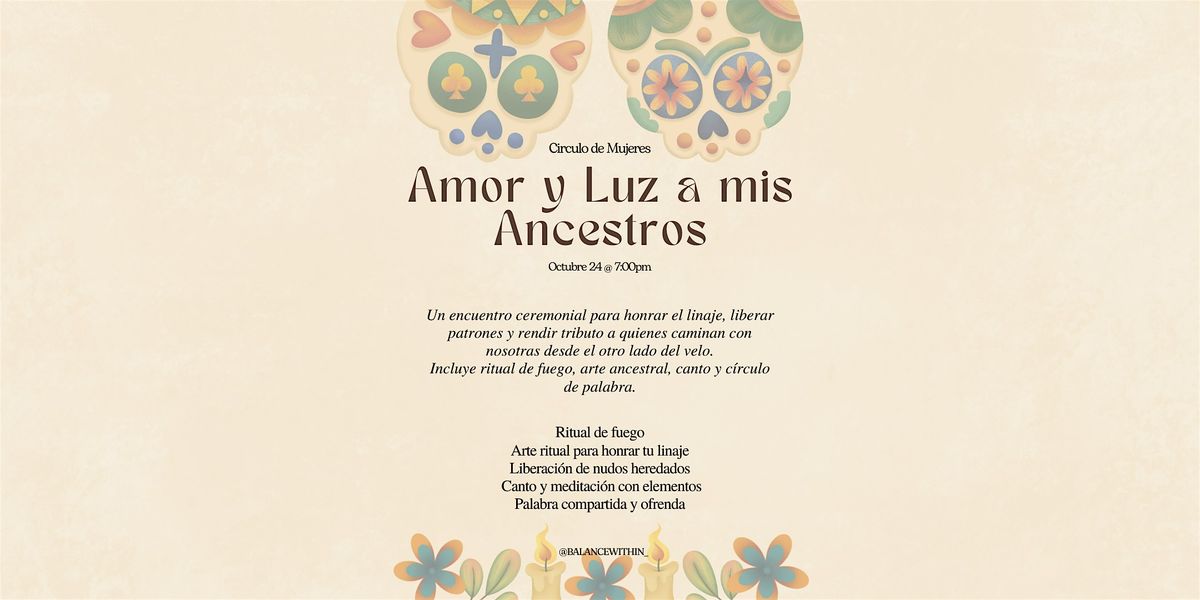 Te invito a un círculo íntimo y ceremonial para honrar a nuestros ancestros y a aquellos que caminan con nosotras desde el otro lado del velo, liberar patrones heredados y reconectar con la sabiduría que vive en nuestro linaje.