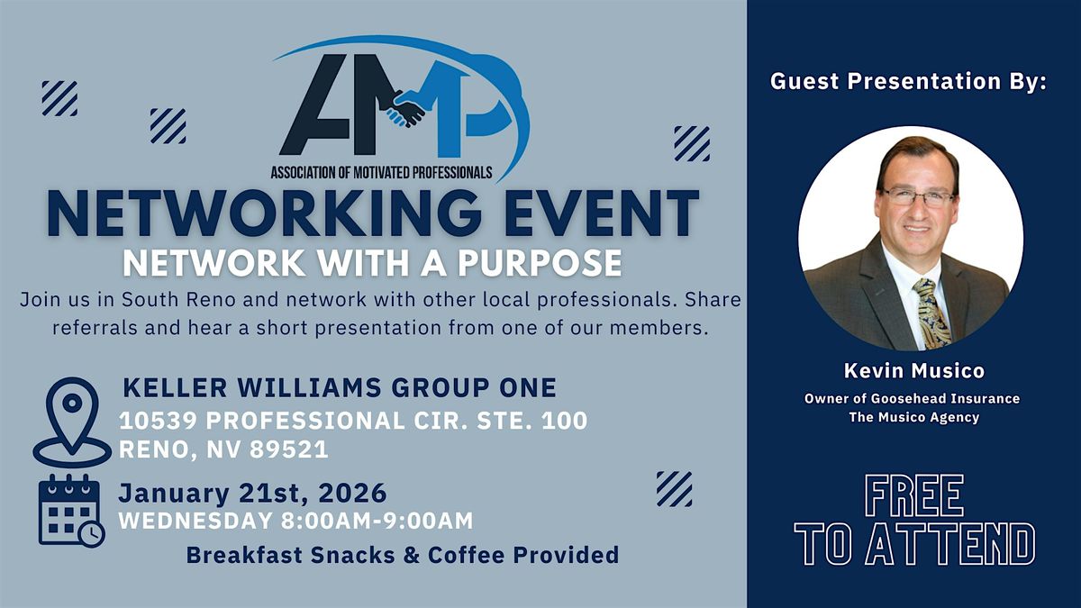 AMP or ‘Association of Motivated Professionals’ is a networking group in Reno that meets bi-weekly. Our membership allows for one representative per industry to allow for consistent referrals between each other. We are looking to grow, so please ask one of our members or our president, Garrett ([email protected]), how to join.