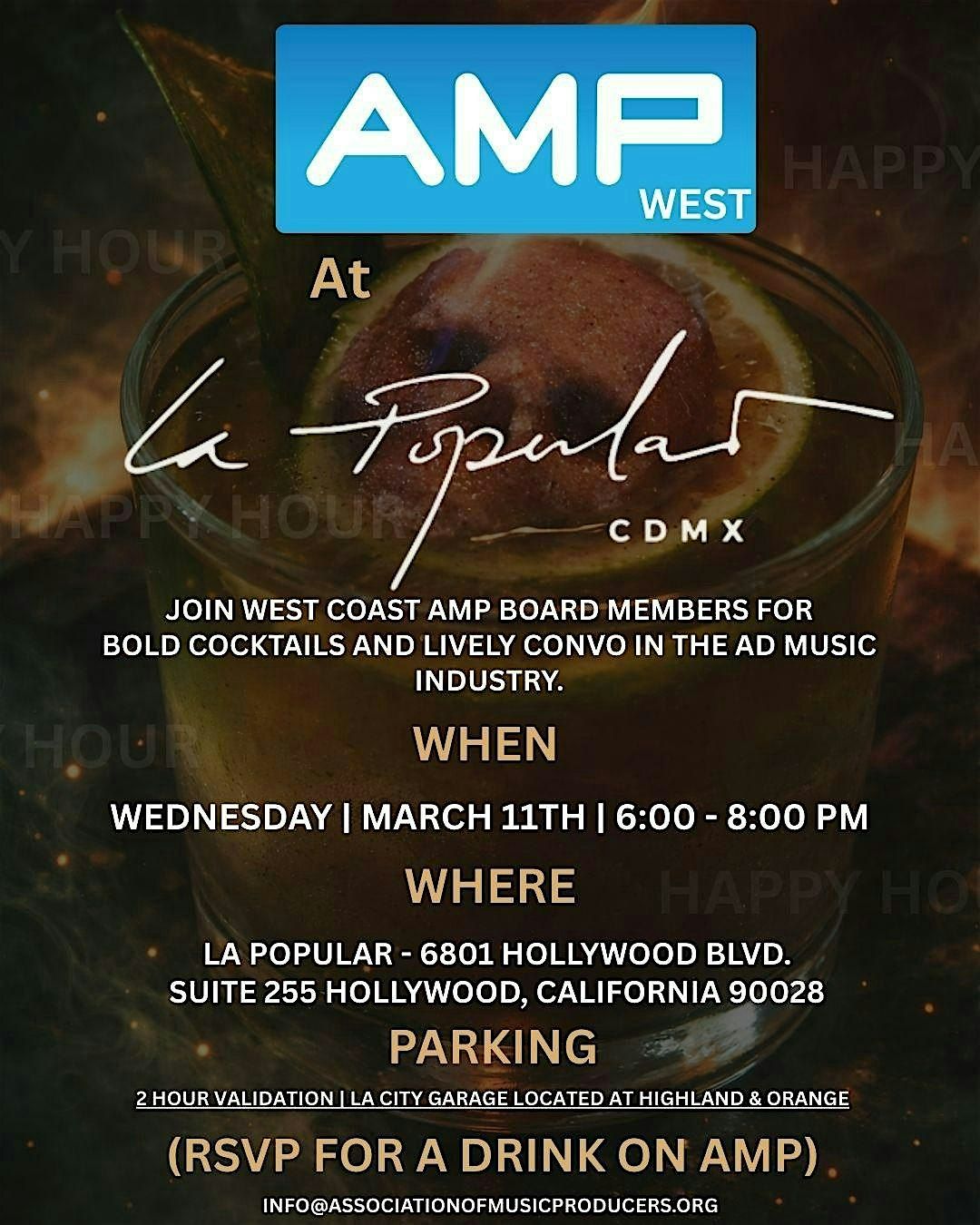 Join us for an in-person Happy Hour at La Popular Hollywood with the West Coast AMP Board. Connect with fellow creatives, producers, and industry peers over libations while diving into conversation about the ad music industry and how AMP can support your career and business growth.