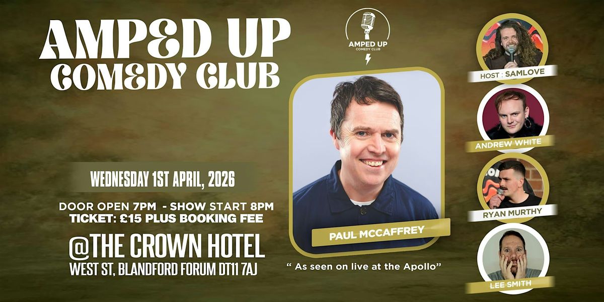 AMPED UP COMEDY CLUB – LIVE IN BLANDFORD FORUM!Get ready for a night of huge laughs and electric atmosphere as Amped Up Comedy Club takes over The Crown Hotel this April!Headlined by the brilliant Paul McCaffrey (as seen on Live at the Apollo), expect razor-sharp wit, hilarious stories, and non-stop comedy gold — joined by a host of other great comedians to keep the laughs coming all night long.Wednesday 1st April 2026