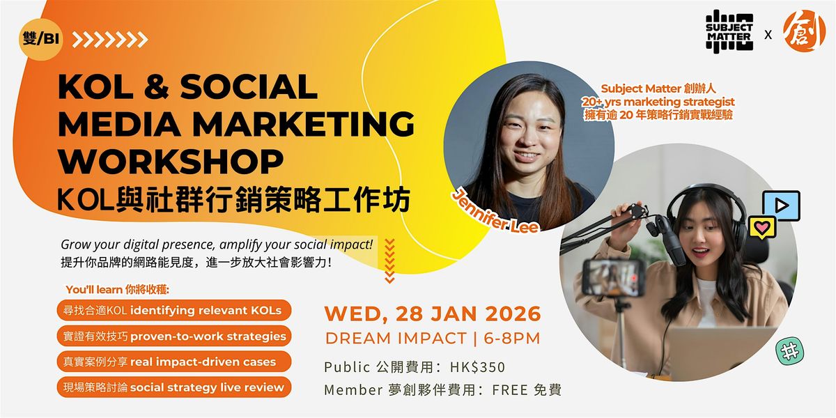 Led by experienced marketing strategist, Jennifer Lee from Subject Matter, this KOL and Social Media Workshop will guide you through the essentials of KOL and social media marketing, helping you build digital visibility and turn your mission into meaningful online momentum.