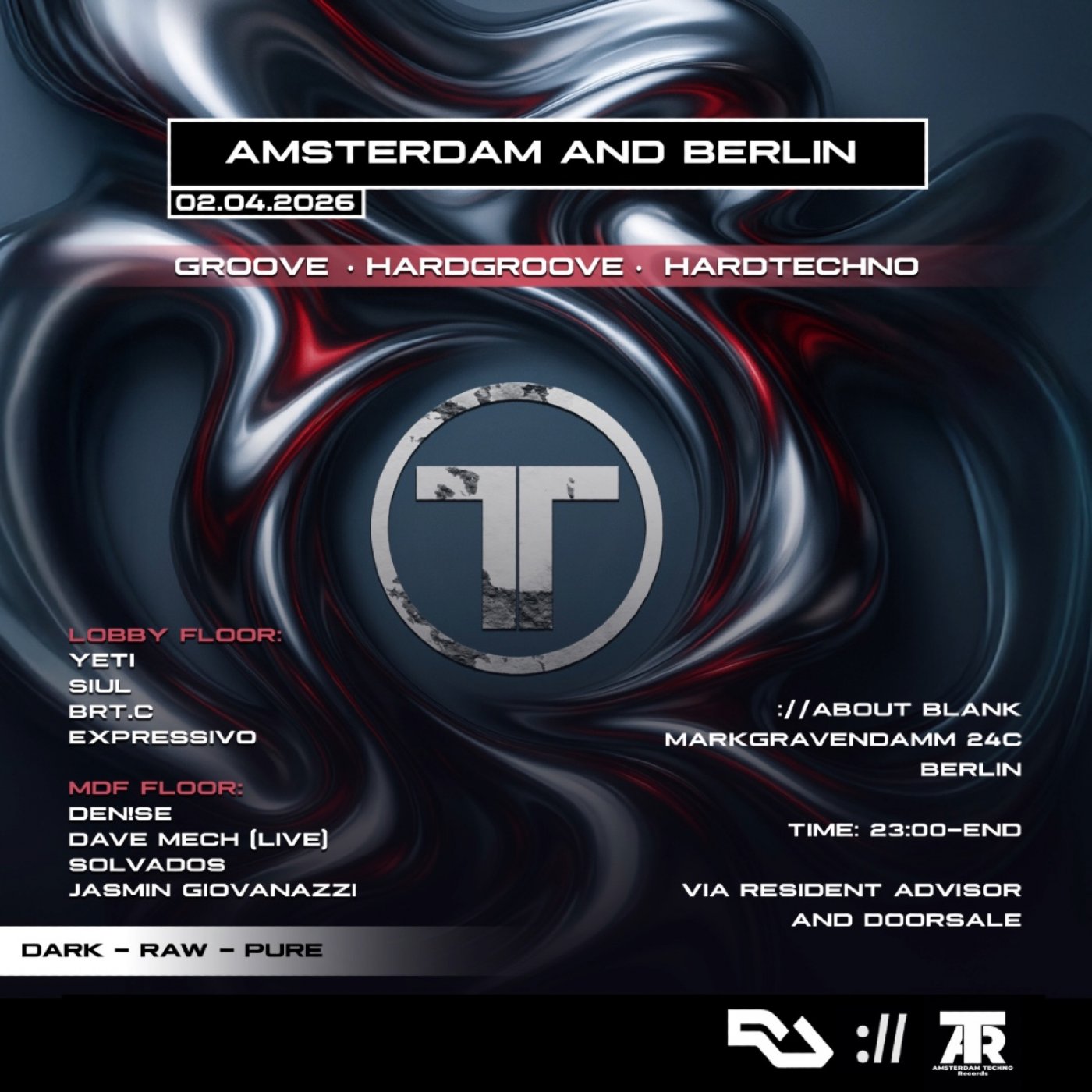 "ATR is about the music. Our artists deliver pure, underground techno from Amsterdam & Berlin combined: Dark, Raw, Real. No filters, no cameras, massive cool venues, ravers, artists, sound and lights.”