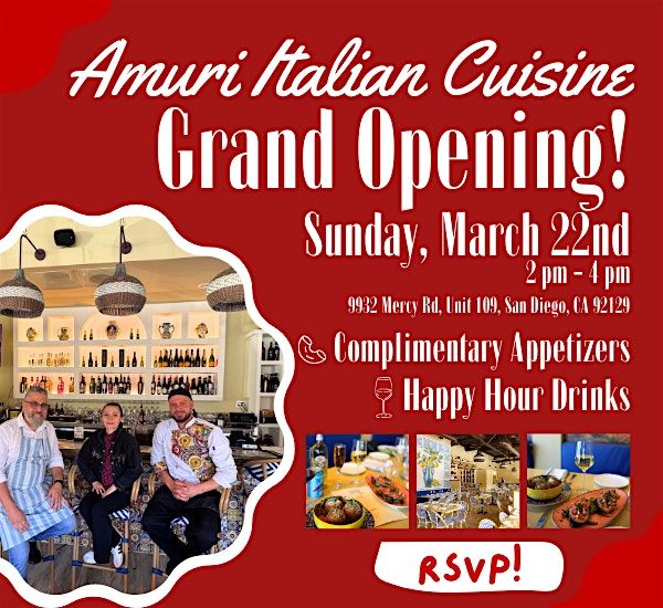 Amuri Italian Cuisine celebrates its Grand Opening! Experience the flavors of Sicily with complimentary passed appetizers and special happy hour pricing throughout the event. Meet the team, explore the space, and be among the first to enjoy an authentic Italian dining experience rooted in tradition and warm hospitality. We look forward to celebrating with you!