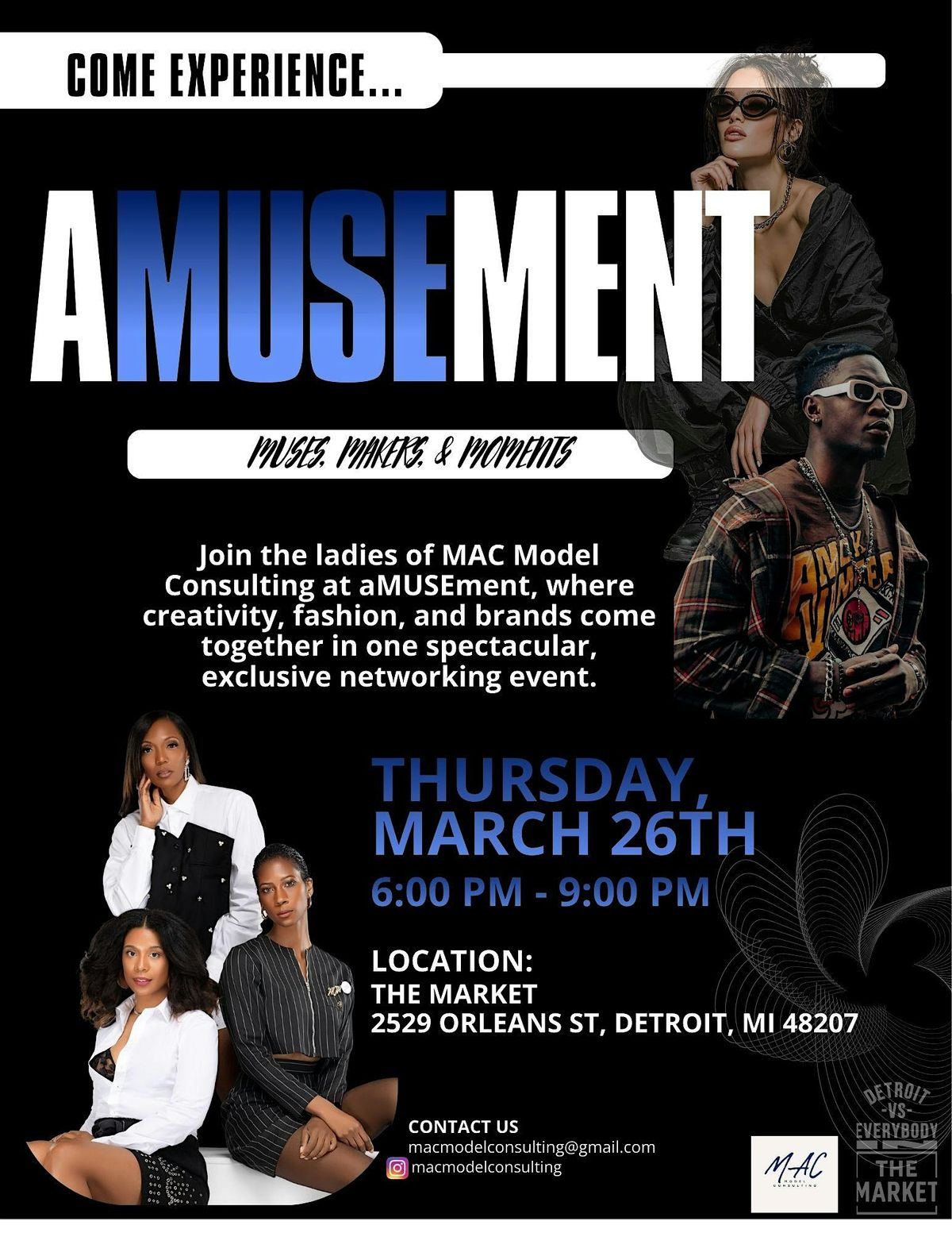 Join us at AMUSEment for a chance to network with some amazing people from the Metro Detroit fashion community. Bring your best energy, and be amused!
