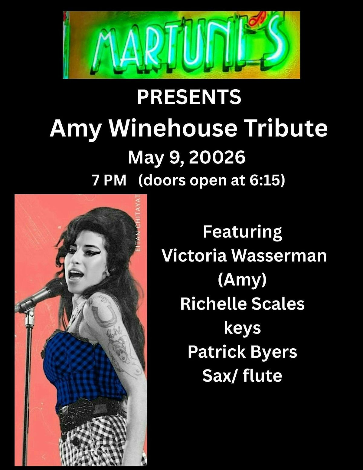 Don't miss your chance to relive Amy's music with the incomparable Back to Black Band featuring singer Victoria Wasserman. Doors open at 6:15 open seating, first come first served.