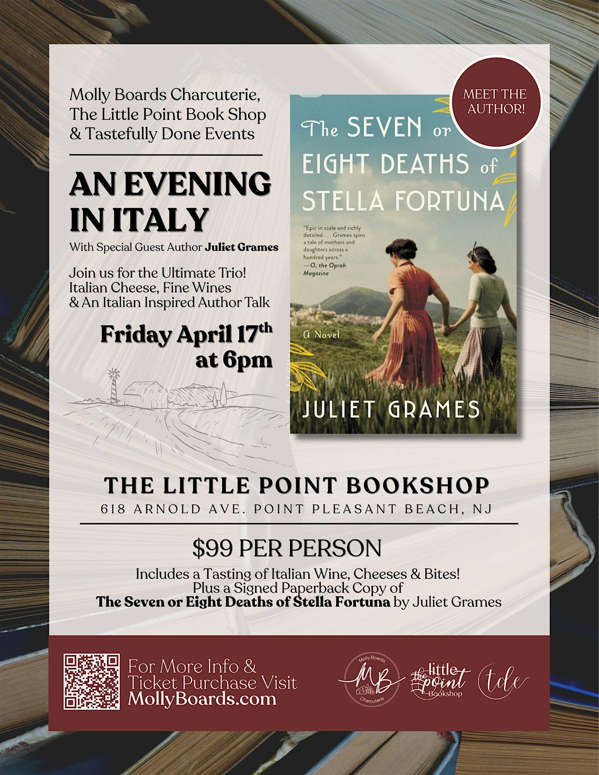 Each ticket includes lovely music, small bites, Italian cheese & wine pairings from Molly Boards +Tastefully Done Events, a signed paperback copy and engaging conversation with the author of The Seven or Eight Deaths of Stella Fortuna, Juliet Grames. This is going to be one incredible evening, and we can't wait to share it with you!