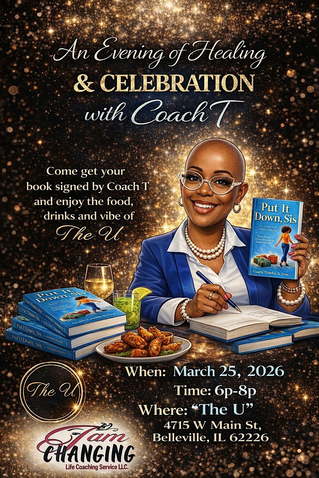 Join Coach T for an intimate evening of healing, connection, and conversation. This special book signing experience includes the opportunity to meet Coach T, have your copy of Put It Down, Sis personally signed, and enjoy the food, drinks, and welcoming vibe of The U.