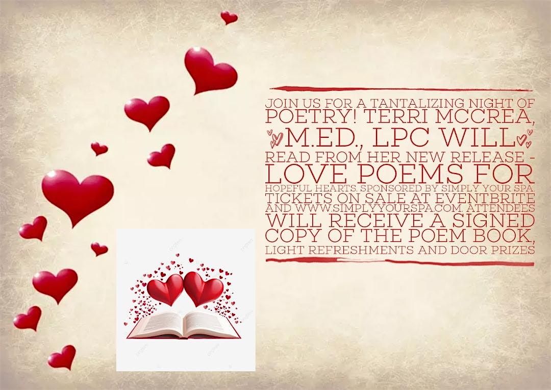 Info: ❤️ to “ Love Poems for Hopeful Hearts: Enjoy an enchanting evening of poetry, music, a book signing and delicious hors d'oeuvres for romantics who believe in happily ever afters and true love.