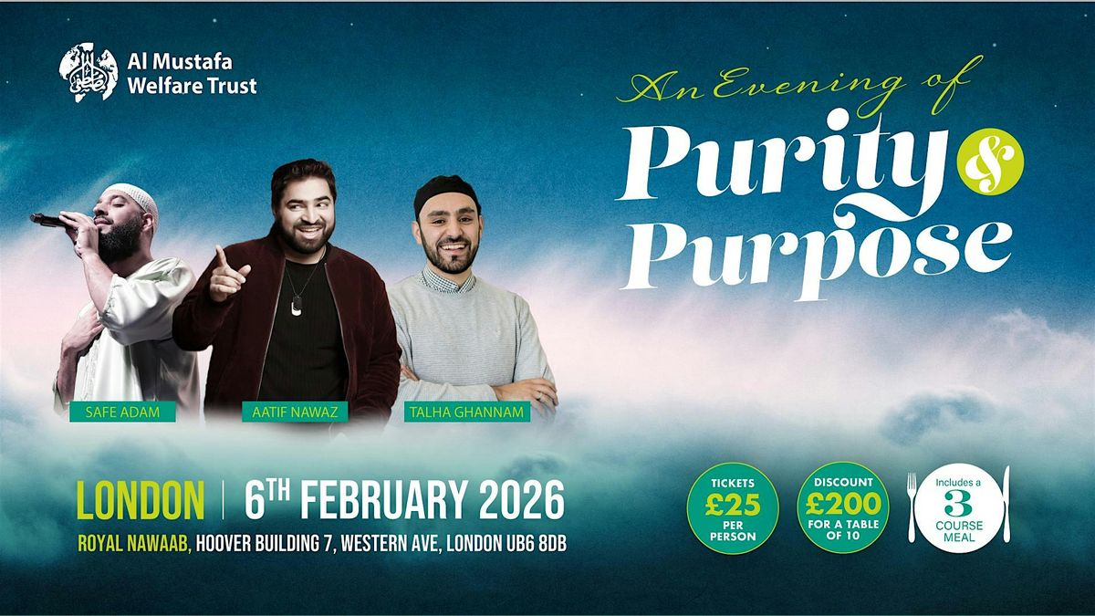 Join us for An Evening of Purity & Purpose — a spiritually enriching and heart-warming gathering featuring renowned performers Safe Adam, Aatif Nawaz, and Talha Ghannam.