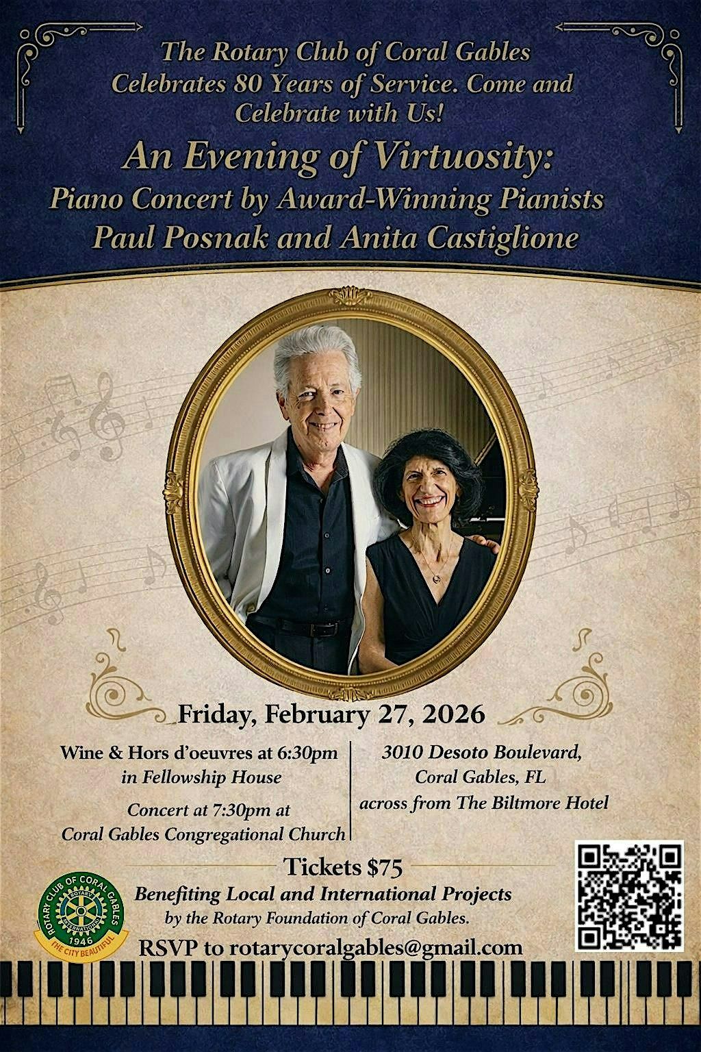 Join the Rotary Club of Coral Gables for a special performance by internationally acclaimed and award-winning pianists Paul Posnak and Anita Castiglione, presented as part of the Rotary Club of Coral Gables' 80th Anniversary Celebration. The performance will be a Duo Piano Recital with a special evening of masterpieces for one piano, four-hands, featuring internationally renowned artists who are Coral Gables residents. The concert will feature sparkling sonatas by Mozart and Francis Poulenc; the hauntingly beautiful Impressionist “Mother Goose Suite” by Maurice Ravel; a lyrical row by the great Black American woman composer Florence Price; dazzling Cuban Danzones by Ernesto Lecuona; and George Gershwin’s brilliant, swinging “Cuban Overture”. This will be a concert not to be missed!