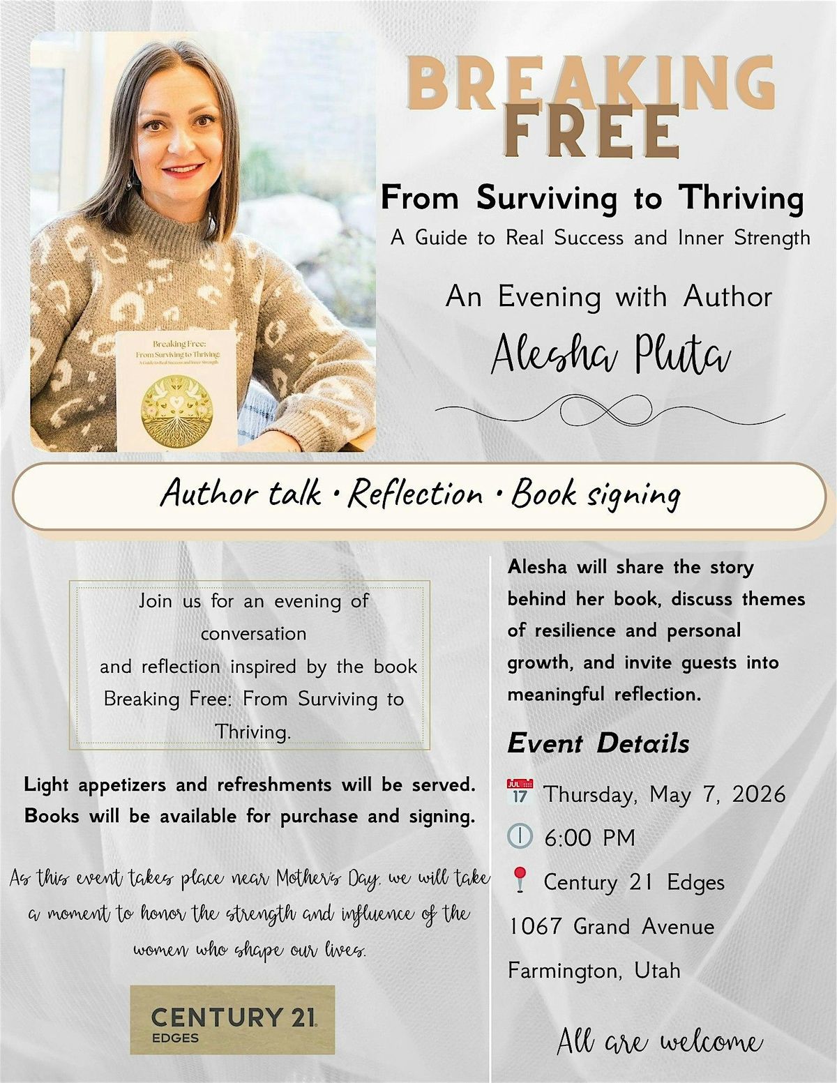 Alesha will share the story behind her book, discuss themes of resilience and personal growth, and invite guests into meaningful reflectionAbout this Event