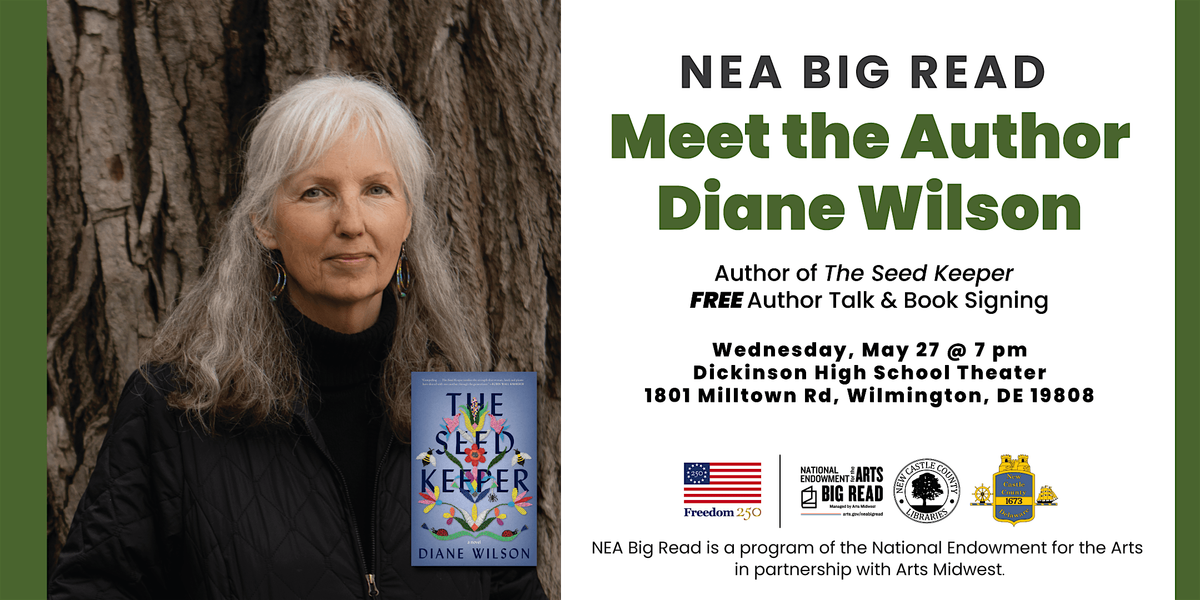New Castle County Libraries is thrilled to bring the National Endowment for the Arts (NEA) Big Read to our community. Award-winning author Diane Wilson will discuss her novel, The Seed Keeper, followed by a book signing.