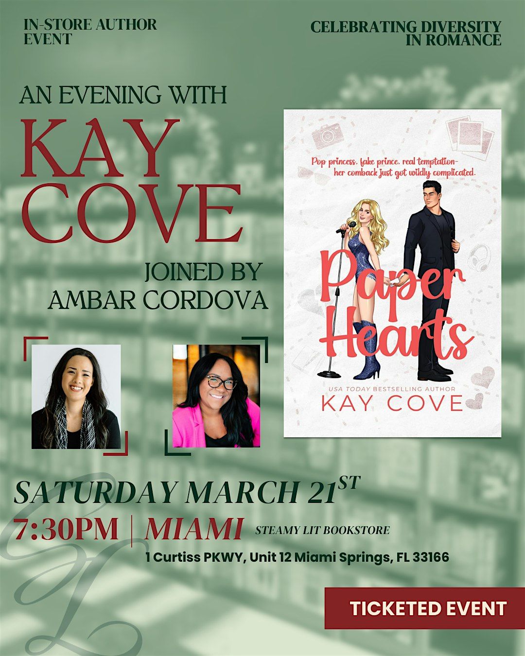 Join the Steamy Lit bookstore team in celebrating Kay Cove's newest release "Paper Hearts". Kay Cove will be in conversation with author Ambar Cordova.