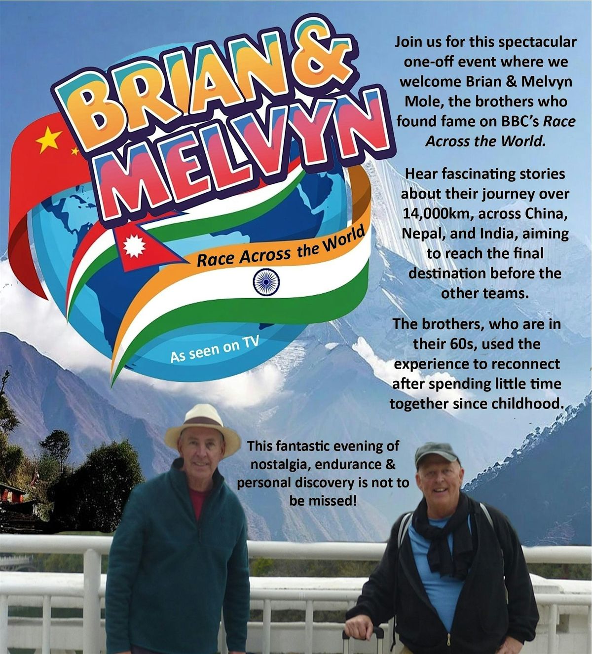 Get ready for a fun and laid-back night in person with Brian & Melvyn Mole, the dynamic duo from BBC's Race Across The World. Dive into their hilarious stories, travel adventures, and behind-the-scenes tidbits. It’s the perfect chance to meet them face-to-face and hear all about their epic journey. Don’t miss this unique event – grab a seat, relax, and enjoy an unforgettable evening!