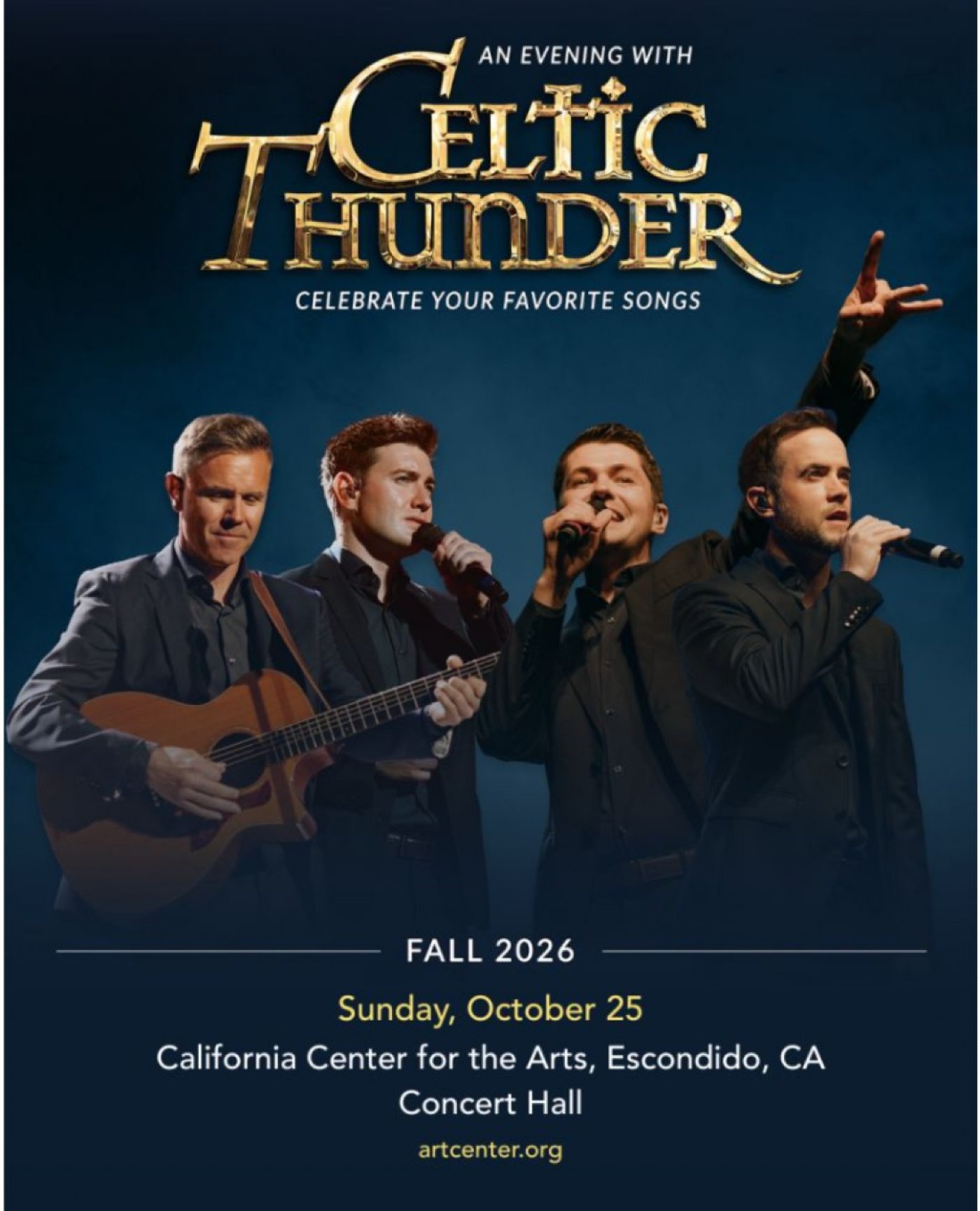 An Evening with Celtic Thunder is more than just a concert—it’s a journey through the group’s incredible legacy. Featuring a carefully curated setlist of their greatest hits, this show will showcase the powerful harmonies, soaring ballads, and electrifying performances that have made Celtic Thunder a household name. From classic Irish folk songs to contemporary favorites, audiences can expect to hear the anthems that have defined Celtic Thunder’s illustrious career. What makes this show even more special is the reunion of familiar faces. Over the years, Celtic Thunder has been home to some of the finest vocalists in the world, and An Evening with Celtic Thunder will see Emmet, Damian, Neil and Ronan perform some of Celtic Thunder’s greatest songs. Longtime fans will be thrilled to see their favorite voices come together, blending their talents in an atmosphere of warmth and nostalgia. “We wanted to create something truly special for our fans, something that feels personal and celebratory,” says Damian McGinty, longtime Celtic Thunder Principal. “This show is about reconnecting—with the music, with each other, and with the people who have supported us throughout the years. It’s a chance to relive the magic of Celtic Thunder in a more intimate way, and we couldn’t be more excited to share this experience with our audience.” Since its inception, Celtic Thunder has captivated global audiences with its stunning performances and rich musical heritage. Known for their dynamic stage presence and ability to blend traditional Irish music with contemporary sounds, the group has sold millions of albums and performed on some of the world’s most prestigious stages.