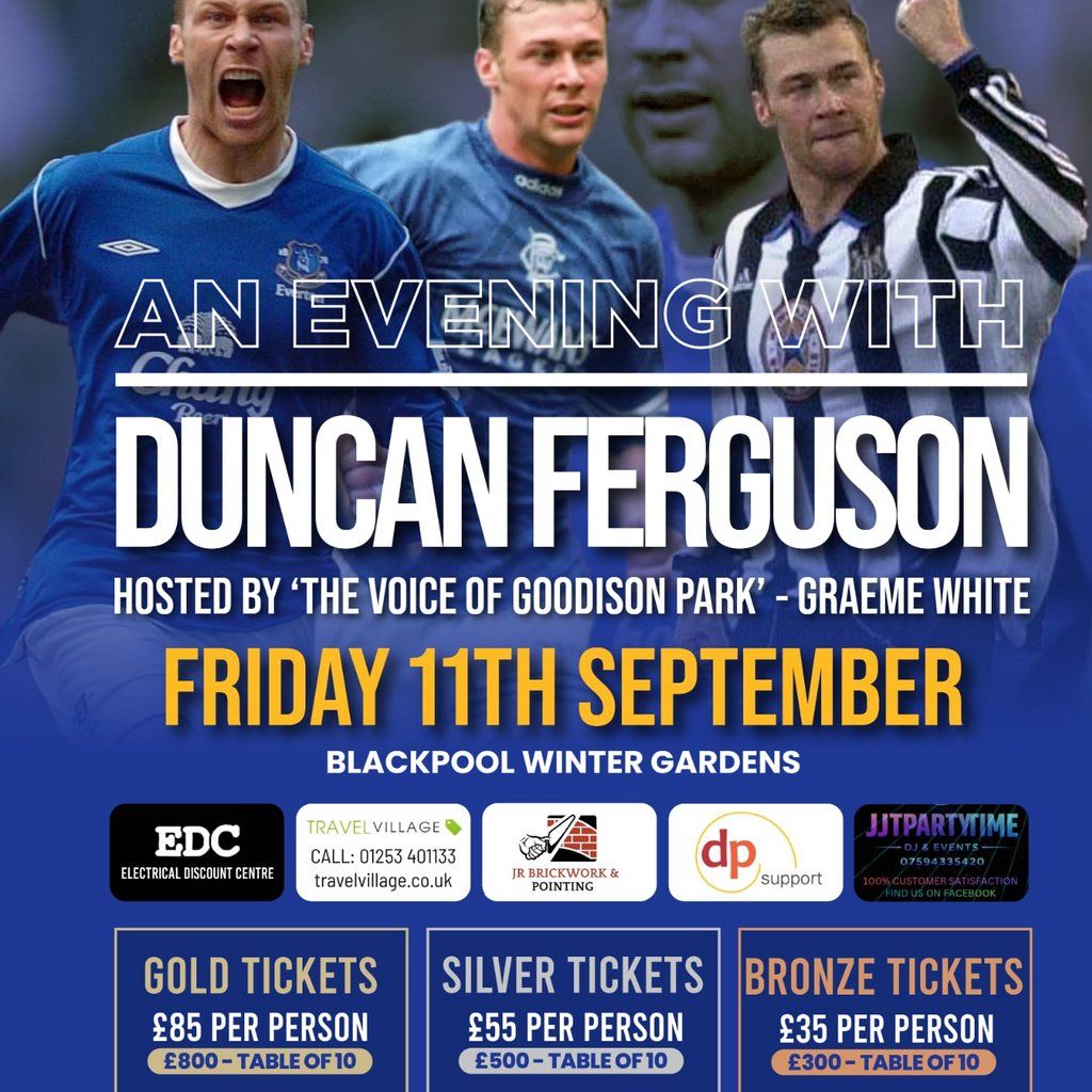A night of unbelievable and crazy stories from football hardman Duncan Ferguson.1st time in Blackpool this is a night not to be missed