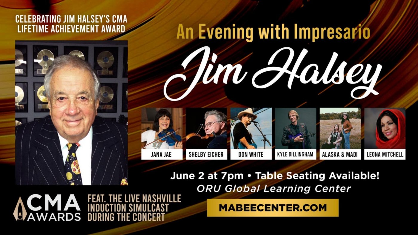 Celebrate legendary music impresario Jim Halsey at a special June 2 concert at the ORU Global Learning Center in Tulsa, honoring his CMA Touring Lifetime Achievement Award. The evening will feature performances by Jana Jae, Don White, Kyle Dillingham, Shelby Eicher, Leona Mitchell and Alaska & Madi, along with a live simulcast of Halsey’s CMA induction from Nashville. Table seating including dinner is available with the option to purchase a full table or single table seats! Proceeds support scholarships for Oklahoma students pursuing careers in the music industry, with a silent auction of signed artists memorabilia.