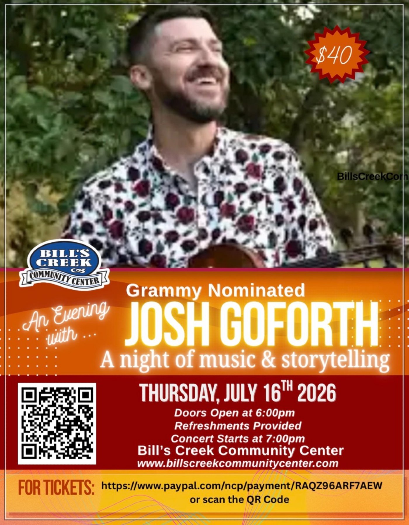 Join us for a special night of music and storytelling with Grammy-nominated musician Josh Goforth. Josh is bring a whole new show to the Bills Creek Community Center. A native of the Blue Ridge Mountains, Josh Goforth brings the mountains to life with hilarious stories, rich traditions, and toe-tapping tunes.