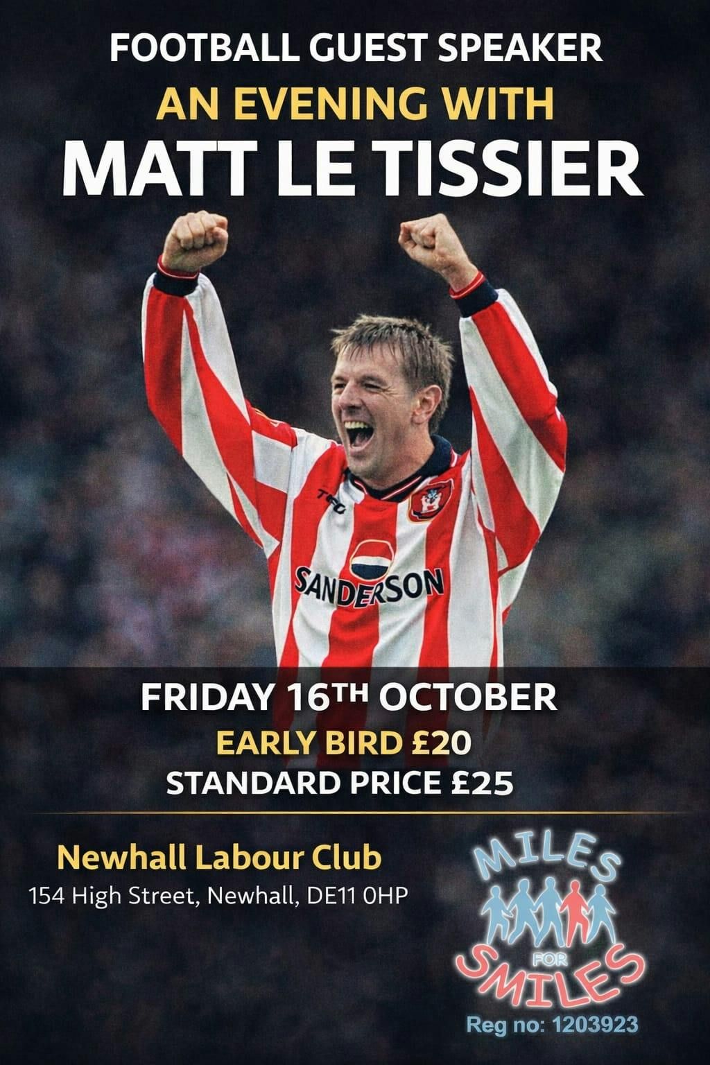 An evening with Matt Le Tissier listening to all stories about his career with Southampton and England . Listening to all the stories that never made the media . with also a comedian on before hand . Disclaimer: