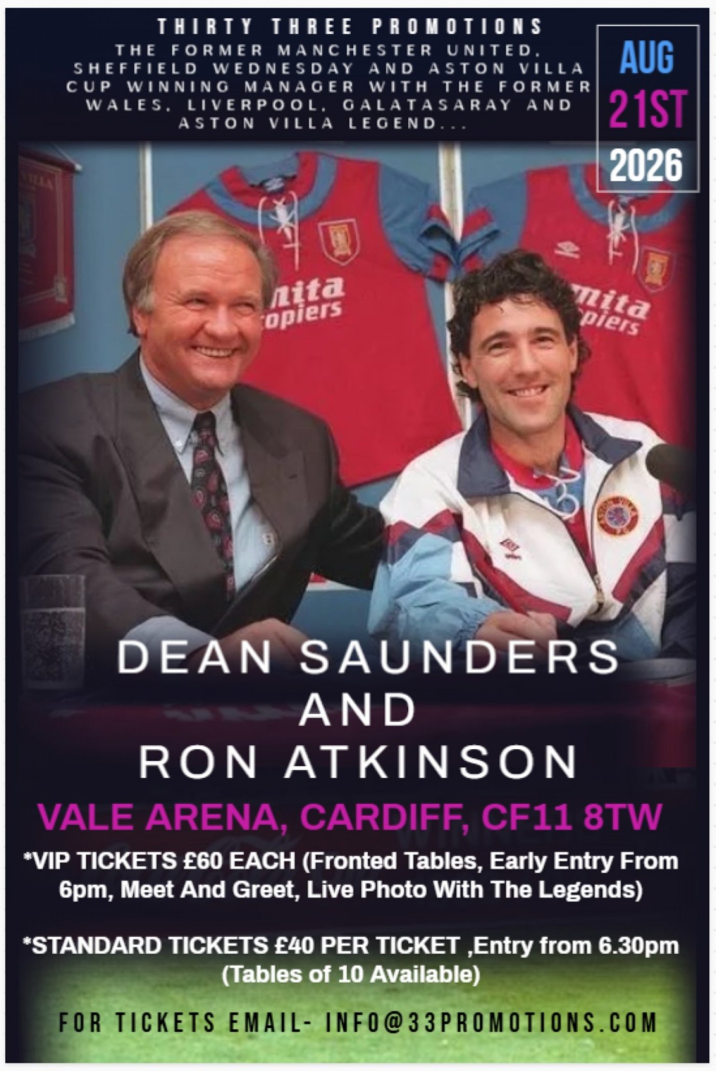 Please join us and the two legends Ron Atkinson and Dean Saunders for a night of entertainment stories and pure laughter.