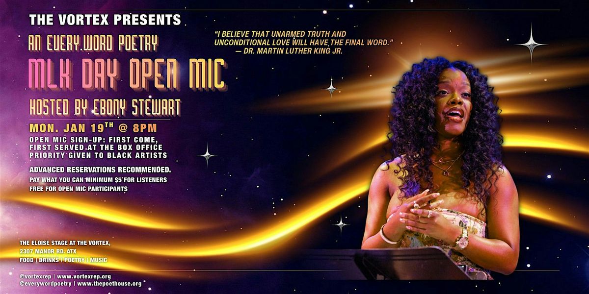 Join us for a special MLK Day edition of the every.Word Poetry Monday Night Open Mic, presented in collaboration with The VORTEX. This annual gathering honors the life and legacy of Dr. Martin Luther King Jr. through poetry, music, and performance that uplift Black voices and celebrate art as resistance, truth-telling, and collective liberation