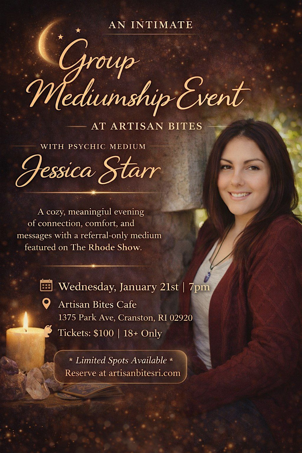 We’re honored to host a Group Mediumship Event at Artisan Bites with Psychic Medium Jessica Starr — a trusted psychic medium with a global client base, known for her warm, grounded, and deeply comforting presence.