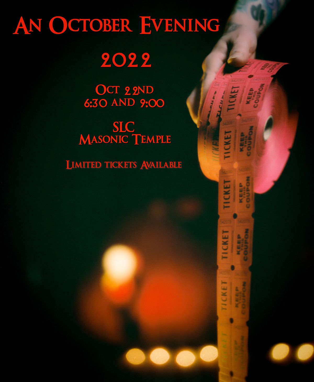 One night only! Two shows with very limited seating in the Masonic's Gothic Room.