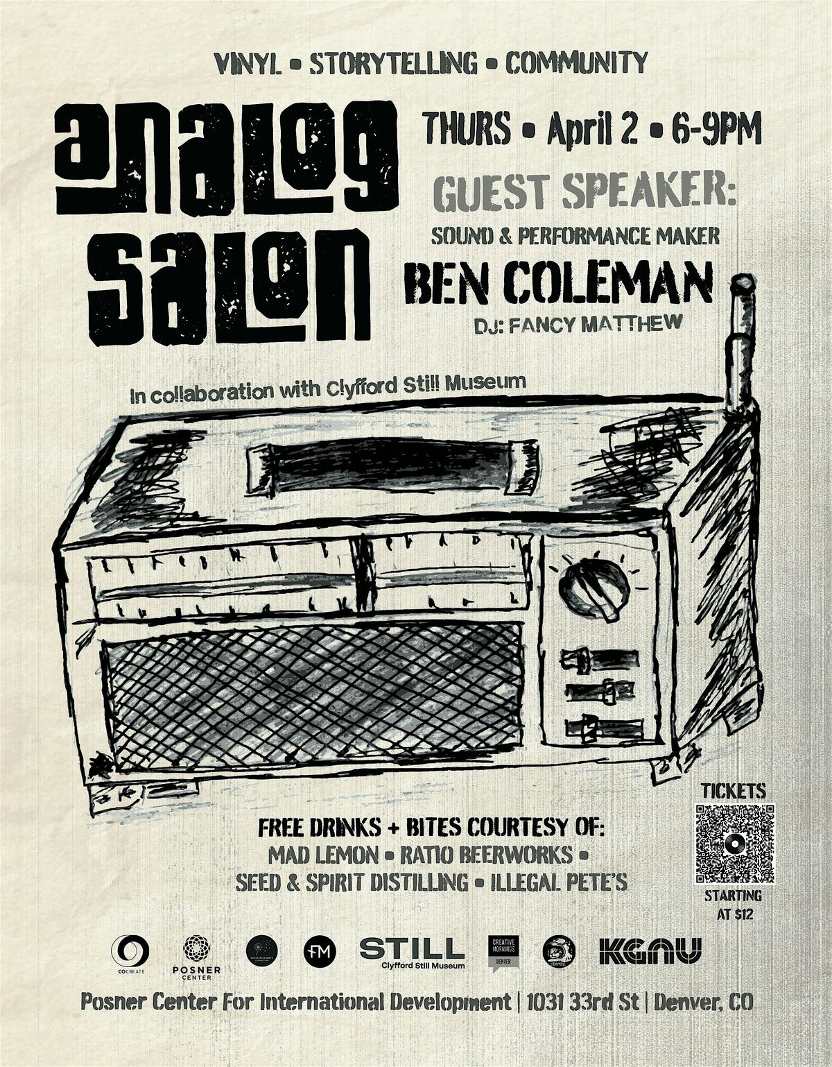 Analog Salon is our third space in Denver. It’s a monthly vinyl listening party where music, memory, creativity, and connection all meet under one roof. Hosted at the Posner Center for International Development, Analog Salon invites people to unplug, slow down, and share space through the rich, nostalgic crackle of vinyl and the honesty of personal storytelling.