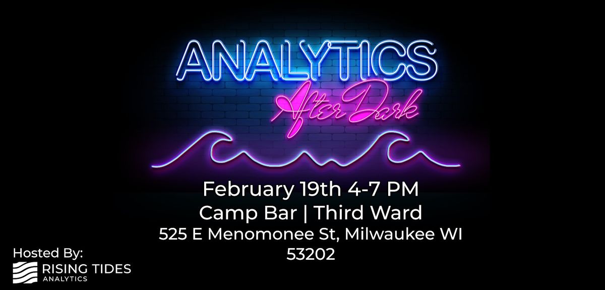 Analytics After Dark is a monthly happy hour event hosted by Rising Tides Analytics. We host this event to bring together data analytics professionals throughout the Greater Milwaukee area to connect, discuss data challenges, and learn from each other.