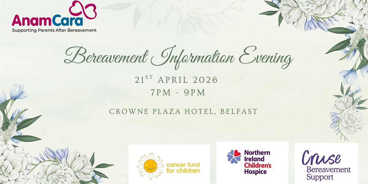 Come join us for an evening of support and information as we navigate the journey of bereavement together. Anam Cara, Cruse Bereavement Support, Cancer Fund for Children and the Northern Ireland Children's Hospice have teamed up to provide a safe space for those who have experienced child loss. Whether you are looking for information, guidance, or resources, this event is for you. Let's walk this path together.