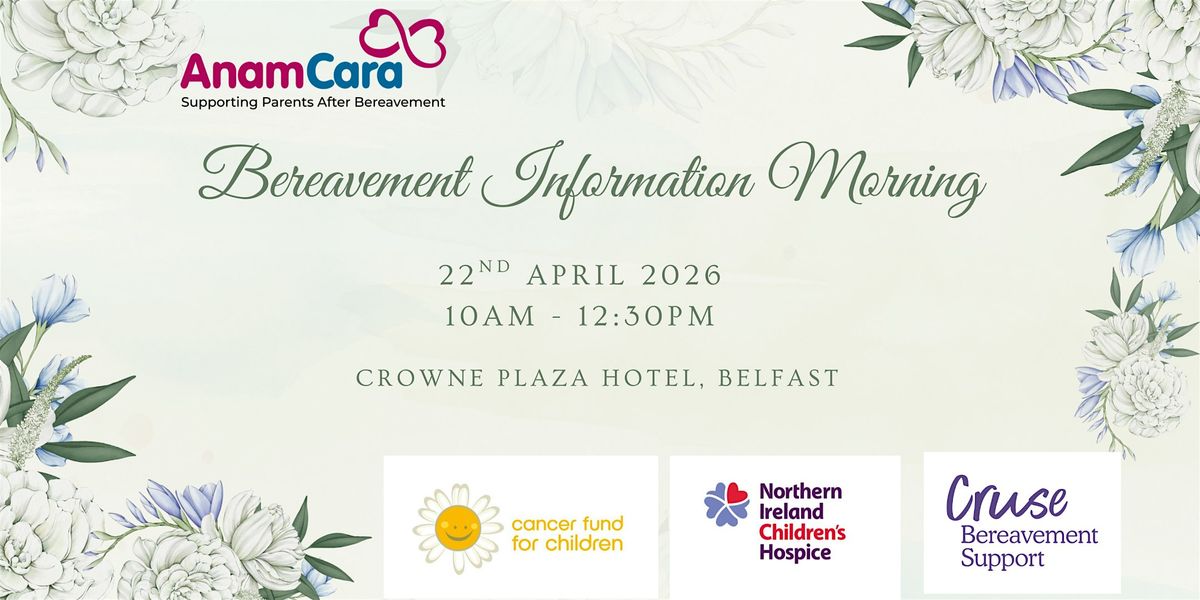 Come join us for an evening of support and information as we navigate the journey of bereavement together. Anam Cara has teamed up with Cruse Bereavement Support, Cancer Fund for Children and Northern Ireland Children's hospice to host a bereavement information morning for professionals worksing with bereaved families. Our keynote speakers are experience bereavement professionals with invaluable knowledge on bereavement & loss. Whether you are looking for information, guidance, or resources, this event is for you. Let's walk this path together.