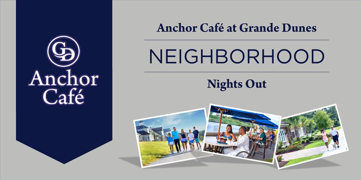 Anchor Café invites you to gather with your neighbors at Grande Dunes’ favorite watering hole for a night of food and fun! Every Tuesday from September 5, 2023 through November 28, 2023, Anchor Café will be serving up discounted food and drinks to residents from each of Grande Dunes’ seventeen different neighborhoods. Enjoy beautiful waterway views, good food and great beverages while making new friends or spending time with old ones. Space is limited, so reserve your spot now. To find your neighborhood’s night out, see the list below: