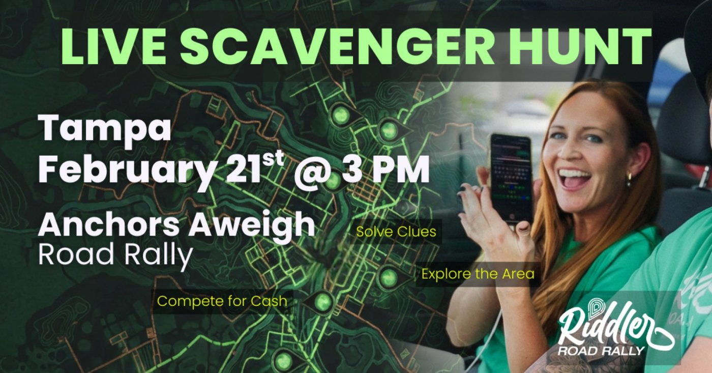 The Anchors Aweigh Rally sends you on a swashbuckling journey through Tampa, following GPS-guided routes and racing from one riddle to the next. Each puzzle solved pushes you closer to the prize, testing sharp wits, quick thinking, and teamwork worthy of a true pirate crew. Play solo or with a team of up to five. 10% of every entry fee fuels a growing cash jackpot with a $500 minimum, split 60/25/15 among the top 3 teams. Keep your course steady—every turn might be the one that puts you ahead of the competition.