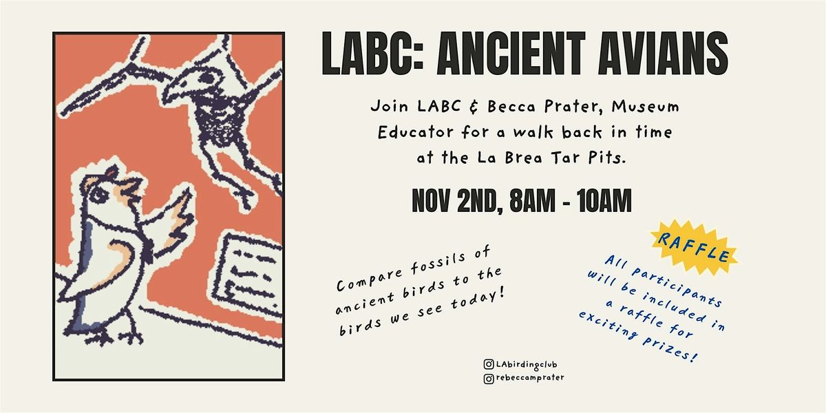 Have you ever wanted to go birding back through time? LABC is teaming up with museum educator Becca Prater for a morning of bird watching and exploring the La Brea Tar Pits! We'll go on a walk around Hancock Park to look for birds, and compare them to the fossil record to see if they're new in town or have been here since the Ice Age. There will be a free raffle at the event for the chance to win stickers and other prizes!