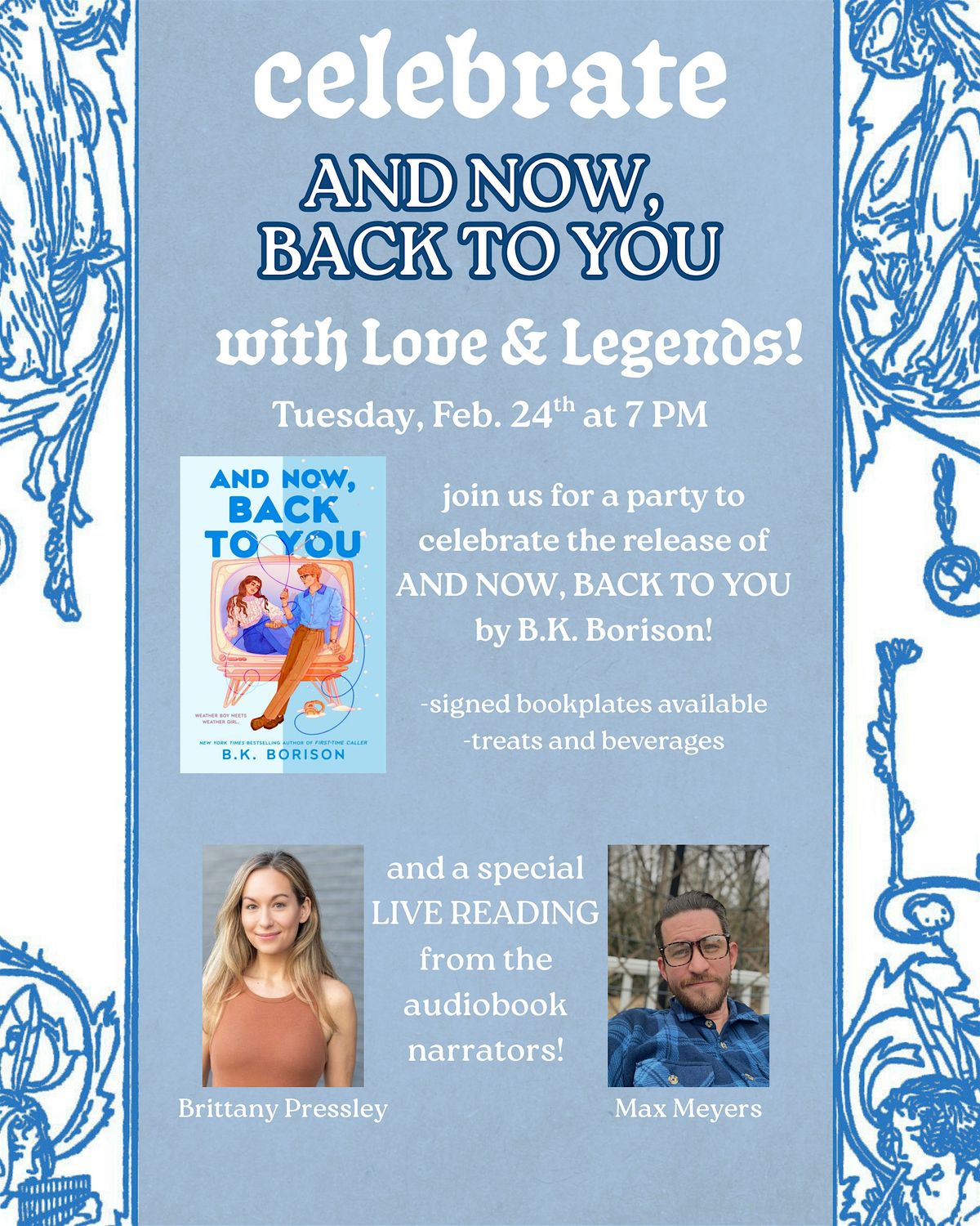 Join us to celebrate the release of BK Borison's newest novel, AND NOW BACK TO YOU.About this Event