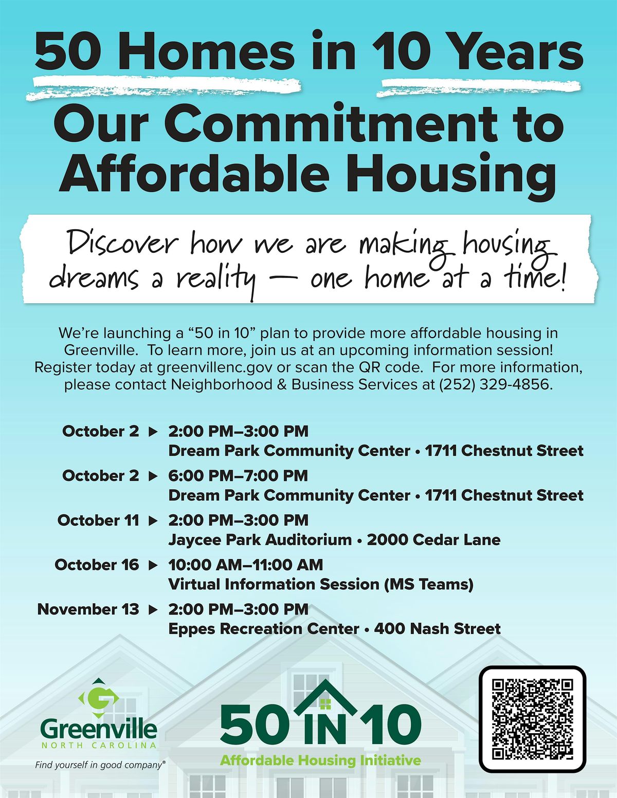 Join us at the Jaycee Park Center located at 2000 Cedar Lane Greenville, NC 27858 for an exciting event! The “50 in 10” Plan is an ambitious initiative to build 50 new homes in 10 years, creating more opportunities for future homeowners to live and thrive in Greenville. Sign up to attend this free info session offered at 2:00 PM, Saturday, October 11, 2025.