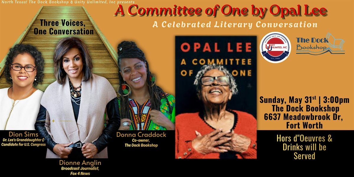 Step in with The Dock Bookshop and Unity Unlimited, Inc. for an engaging, intimate literary conversation centered around A Committee of One by Dr. Opal Lee. This inspirational memoir and self-help guide from the "Grandmother of Juneteenth" explores How Faith + Action = A PurposeFULL Life. A testament to the transformative power of resilience, faith, and love, this special event offers a unique opportunity to hear from dynamic guest speakers who are intimately connected to Dr. Lee and our community.