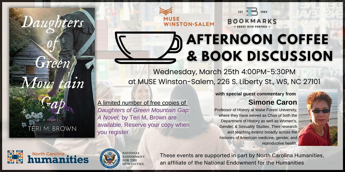 Join MUSE Winston-Salem and Bookmarks for a discussion of Teri M. Brown's Daughters of Green Mountain Gap on Wednesday, March 25, 4:00pm, at MUSEws, 226 S. Liberty Street in the heart of Winston-Salem. We'll be joined by special guest Simone Caron, Professor of History at Wake Forest University, where they have served as Chair of both the Department of History as well as Women's, Gender, & Sexuality Studies. Their research and teaching extend broadly across the histories of American medicine, gender, and reproductive health.