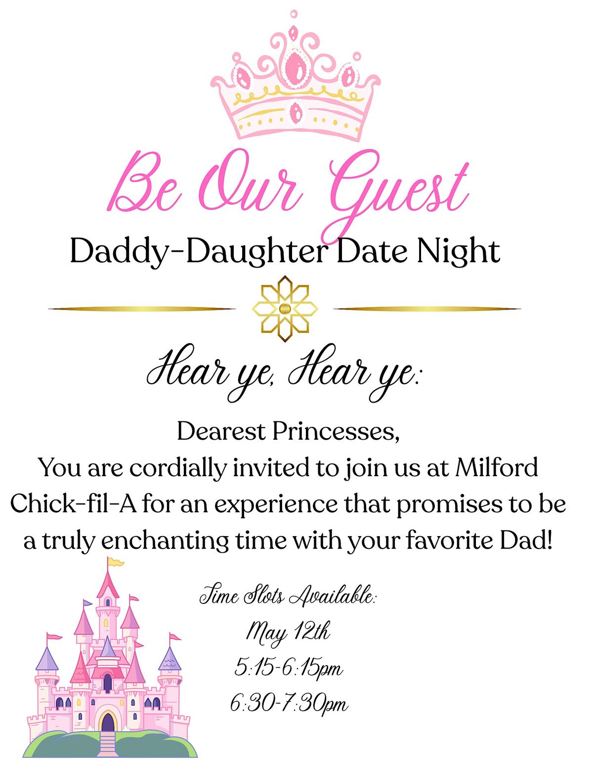 Be our guest, Dads and daughters! Get ready for a fun night full of laughs, memories, and special moments together at Milford Chick-fil-A!