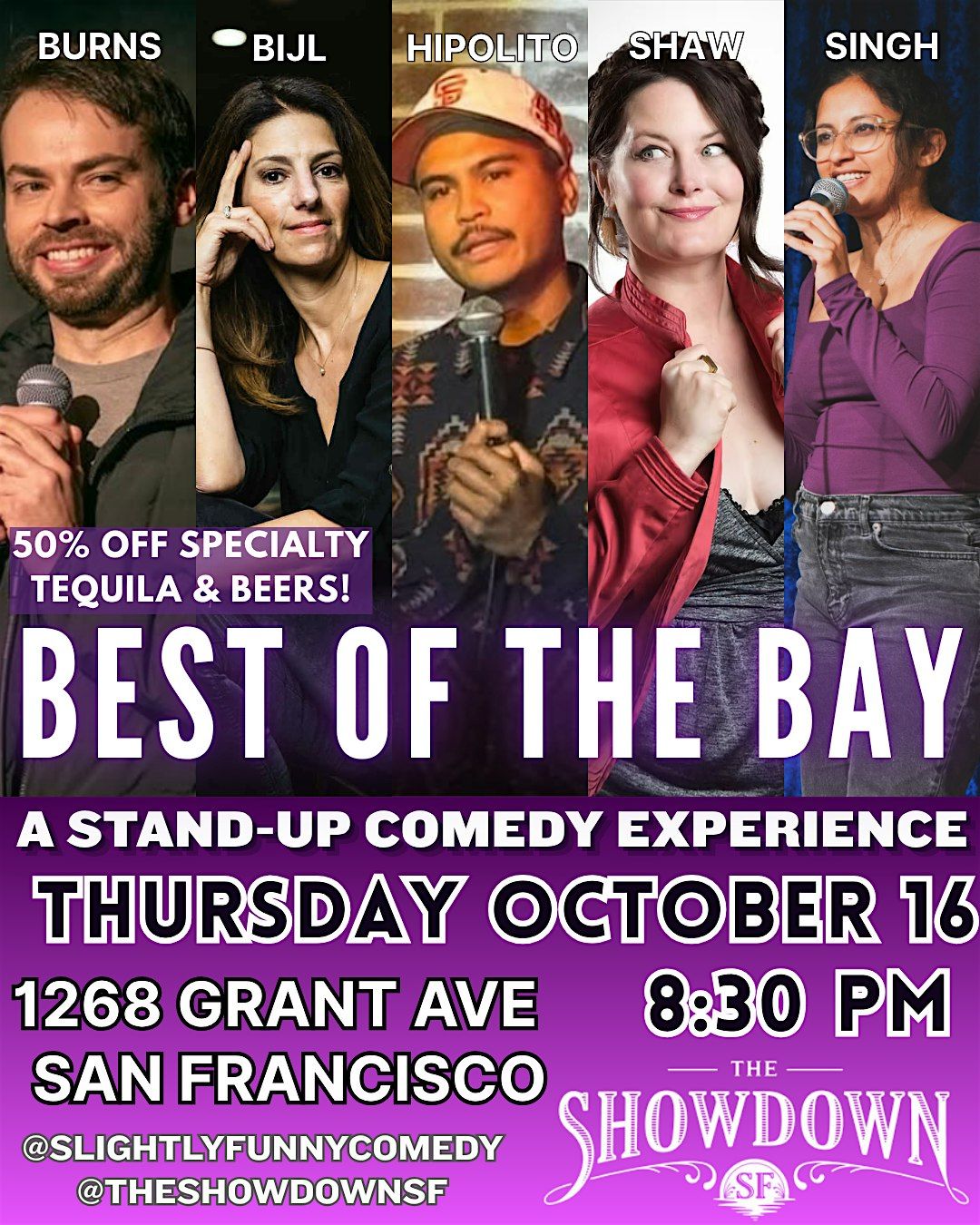 Welcome to "BEST OF THE BAY" Stand-Up Comedy at The Showdown located in North Beach, SF! Get ready for a night filled with laughter and entertainment as some of the best comedians in the Bay Area take the stage. Join us for a fun evening of hilarious jokes and good vibes. Don't miss out on this opportunity to enjoy top-notch stand-up comedy in person at The Showdown. Grab your friends and come on down for a night you won't forget!
