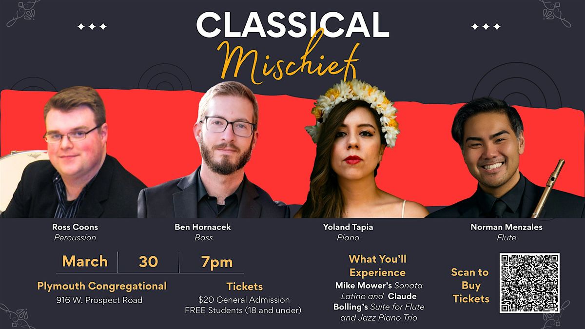 Get ready for a fun and lively evening with Classical Mischief! This dynamic performance brings classical music into playful conversation with jazz, blending soaring flute lines and jazzy piano grooves in an up-close, high-energy setting. Featuring Norman Menzales, Principal Flute of the Wyoming and Fort Collins Symphonies; Yolanda Tapia, piano, University of Toronto and Western Ontario; Ben Hornacek, bass, Wyoming Symphony; and Ross Coons, percussion, Wyoming Symphony. The program features Mike Mower’s Sonata Latino—a rhythm-driven work infused with Latin jazz energy and improvisatory spirit—alongside Claude Bolling’s Suite No. 1, a beloved crossover classic that fuses Baroque elegance with swing, blues, and irresistible jazz grooves.