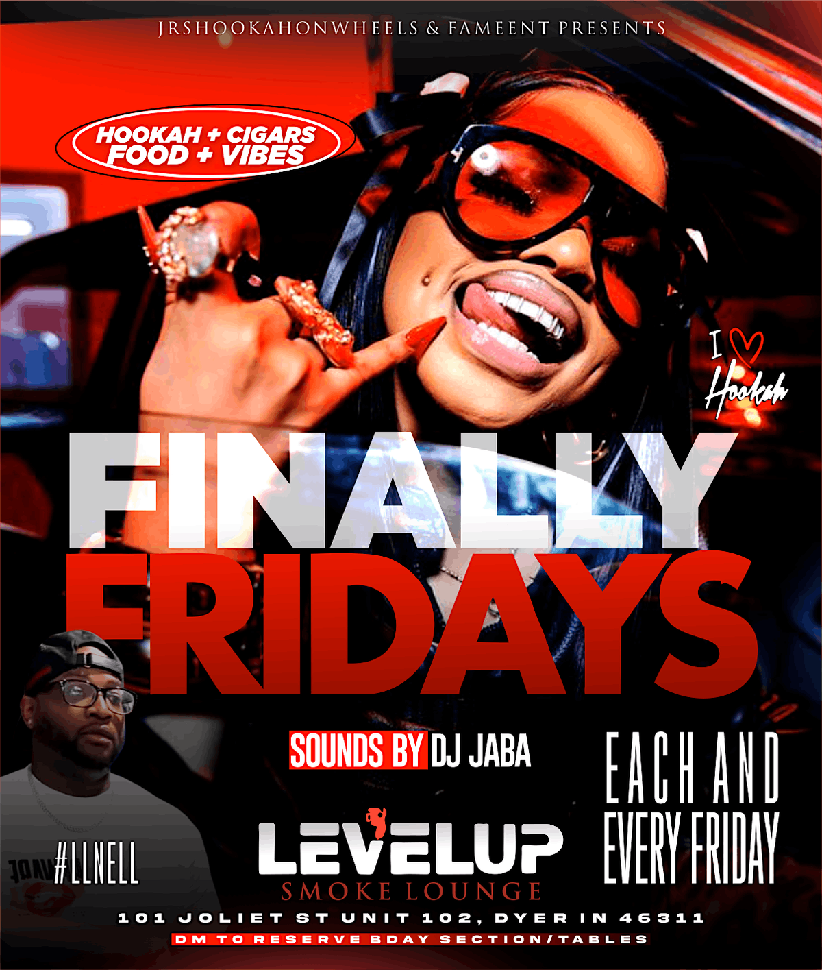 "FINALLY FRIDAYS" 9pm-2am📍@levelupsmokelounge This FRIDAY... WE LITT‼️ *Great Vibes *Hookah *Cigars *Food *Drinks available ALL LADIES FREE B4 10PM (with RSVP)- BIRTHDAY'S TAP IN!! 🎉♑️💨🍾🔥 #LongLiveFameBoyNell #thingstodoinchicago #northwestindiana