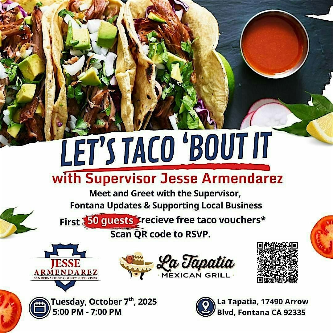 Let's Taco About It with Supervisor Armendarez is finally happening! Join us at La Tapatia Mexican Grill for a fun and engaging event where you can chat with Supervisor Armendarez about all things important to you. This in-person event is your chance to have your voice heard, enjoy some delicious tacos, and connect with others in the community. Don't miss out on this unique opportunity to taco 'bout what matters most to you!#NATIONALTACODAY #TACOTUESDAY #2NDDISTRICT #SUPERVISORARMENDAREZ
